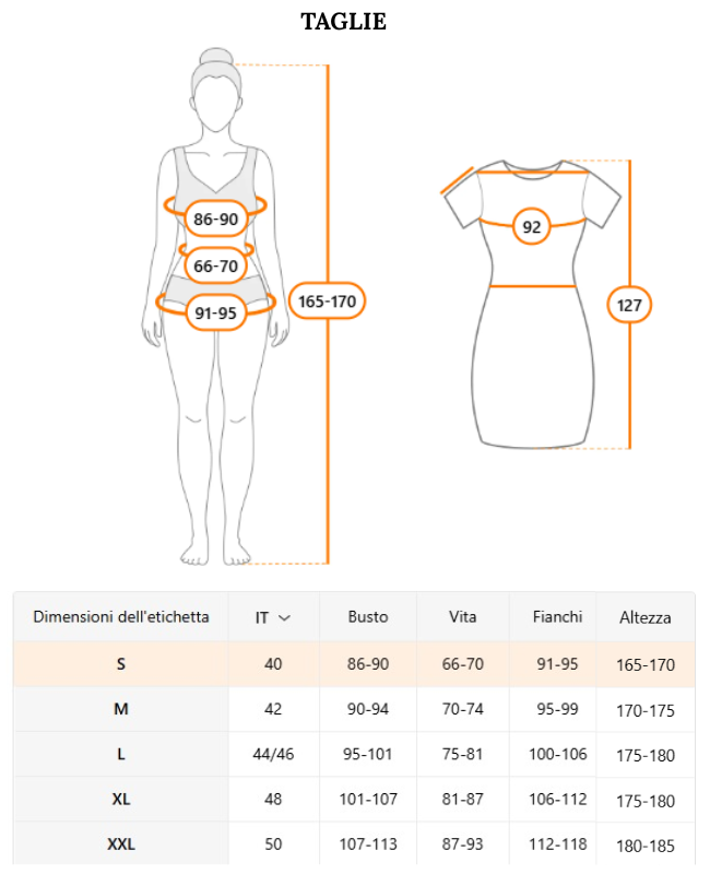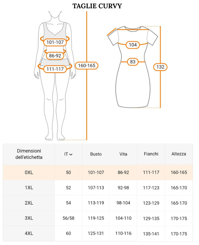 Disponibile nelle taglie dalla S alla XXL e nelle taglie curvy: 0XL, 1XL e 2XL.